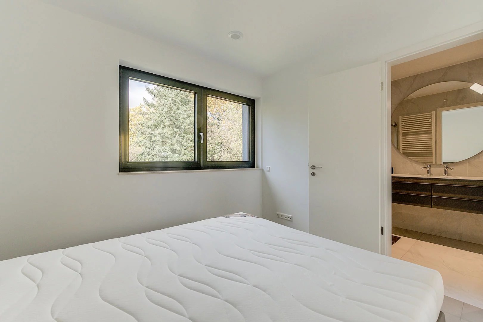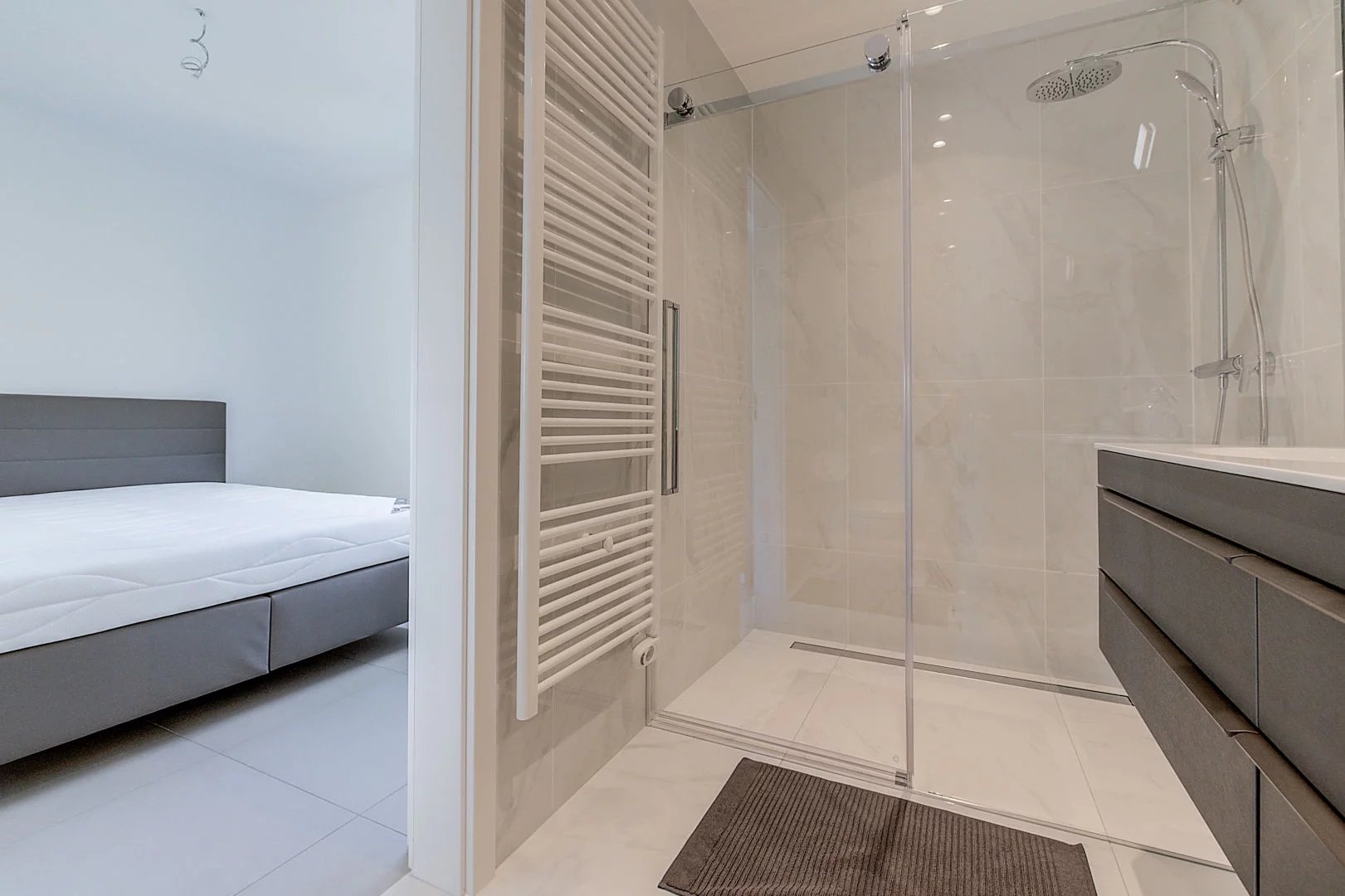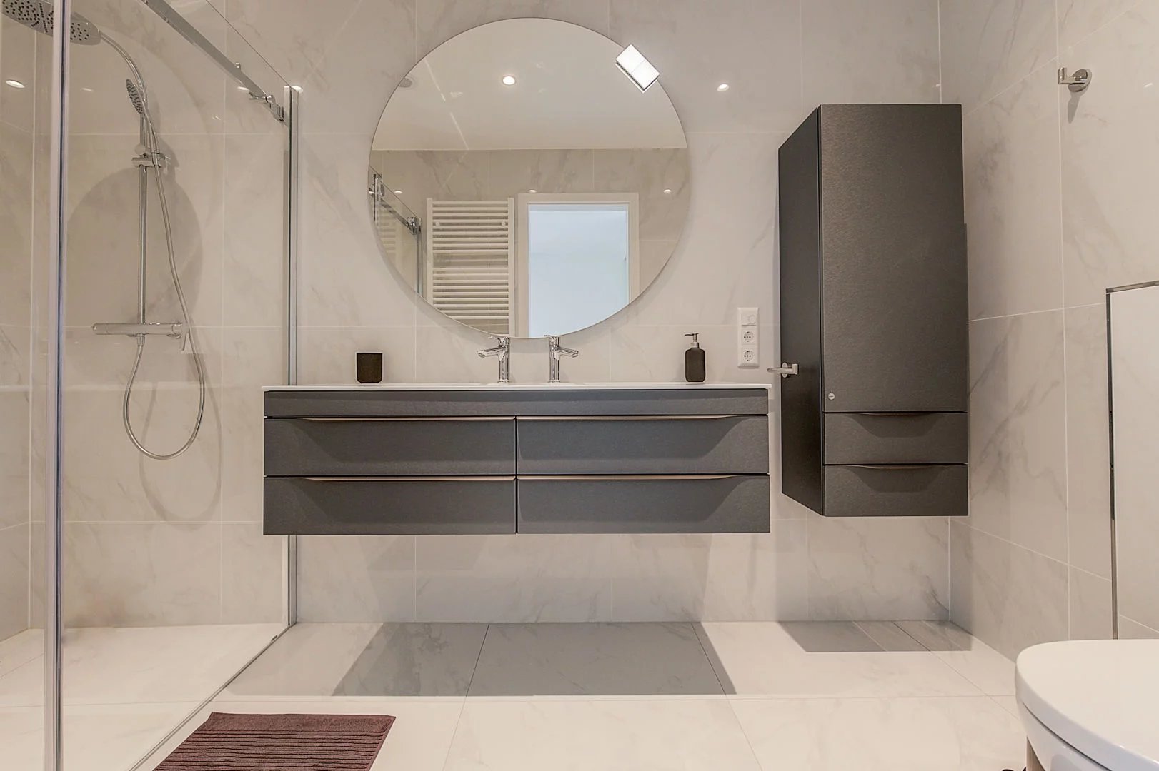 - Une salle de douche avec douche à l'italienne, double vasque et WC ;