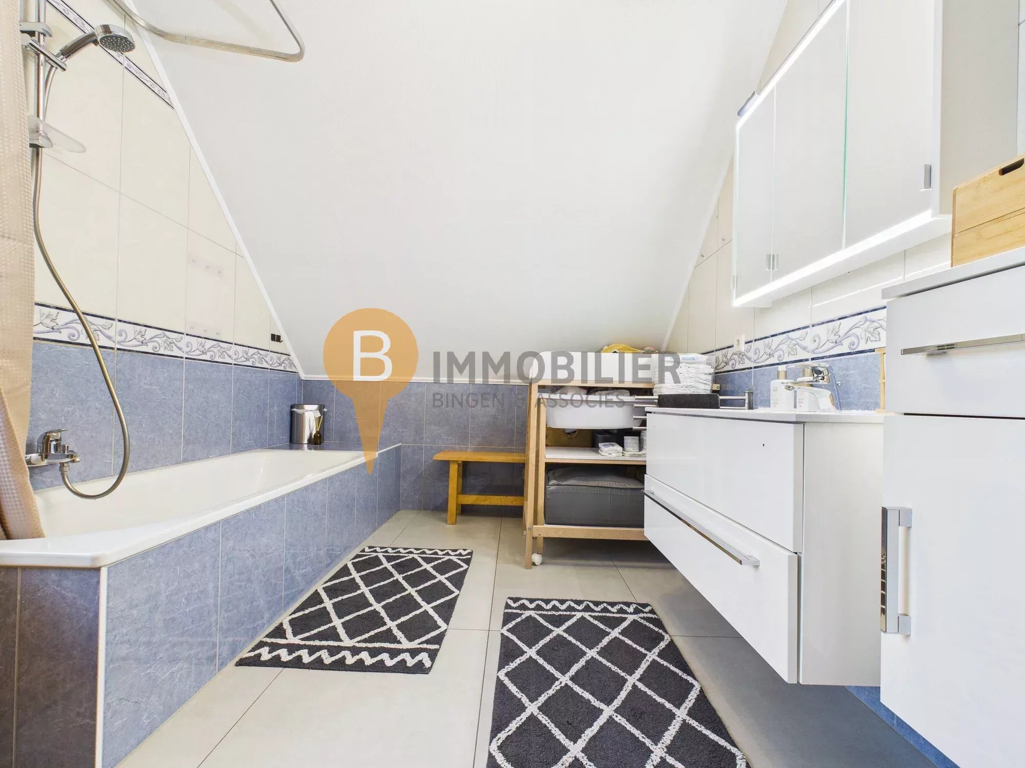 - Salle de bains (surface mansardée, env. ± 6,4 m2 au total)