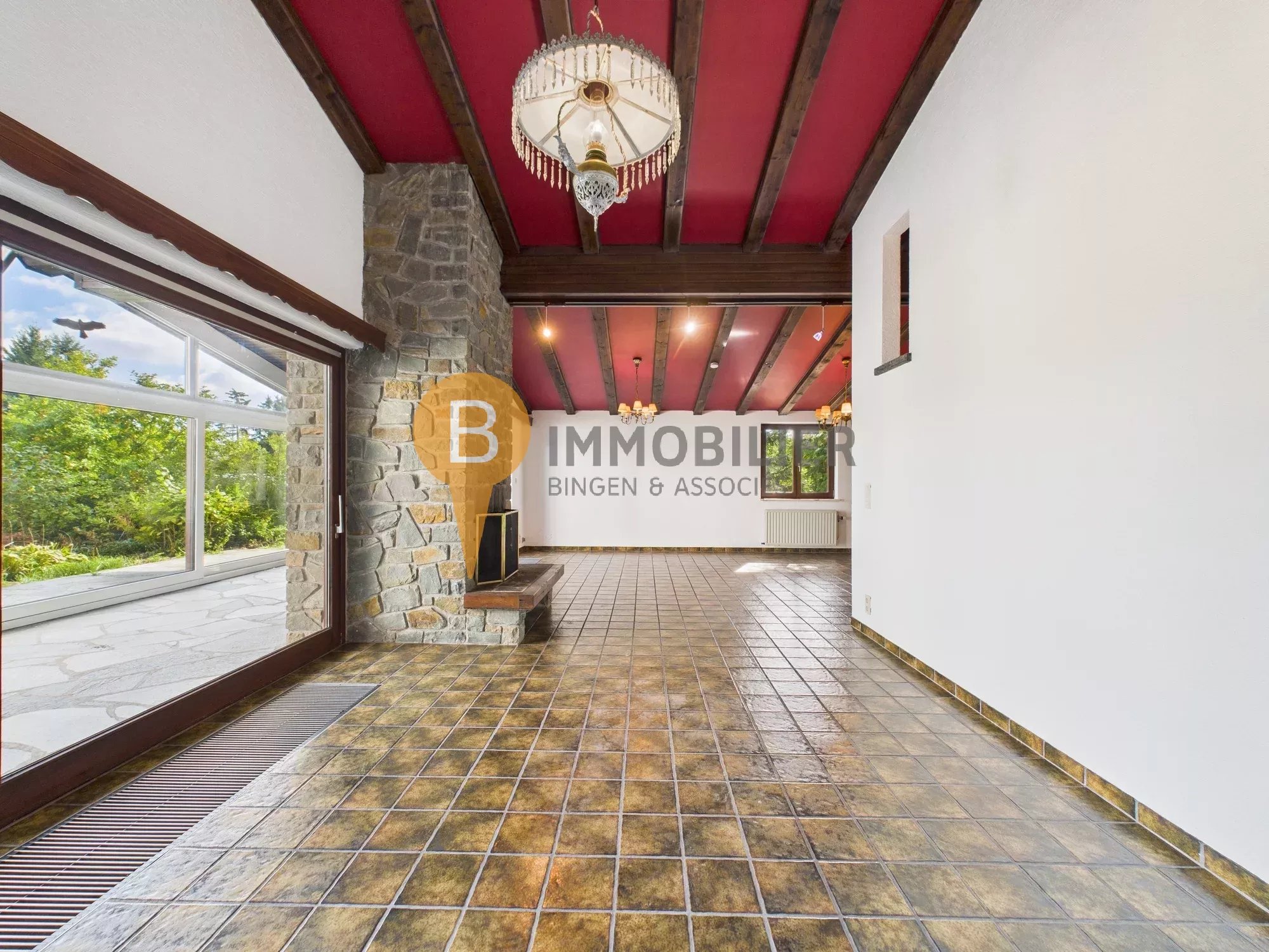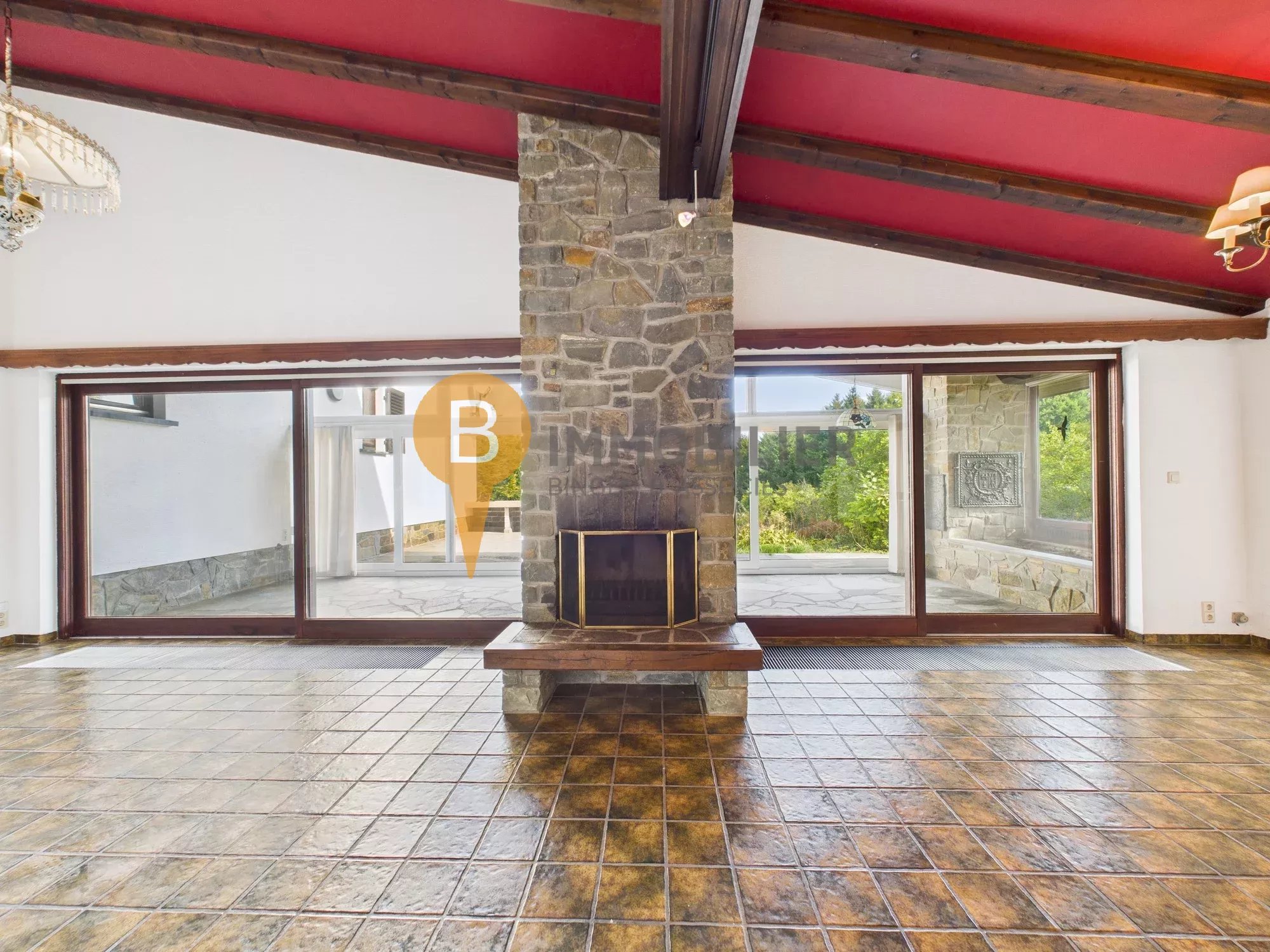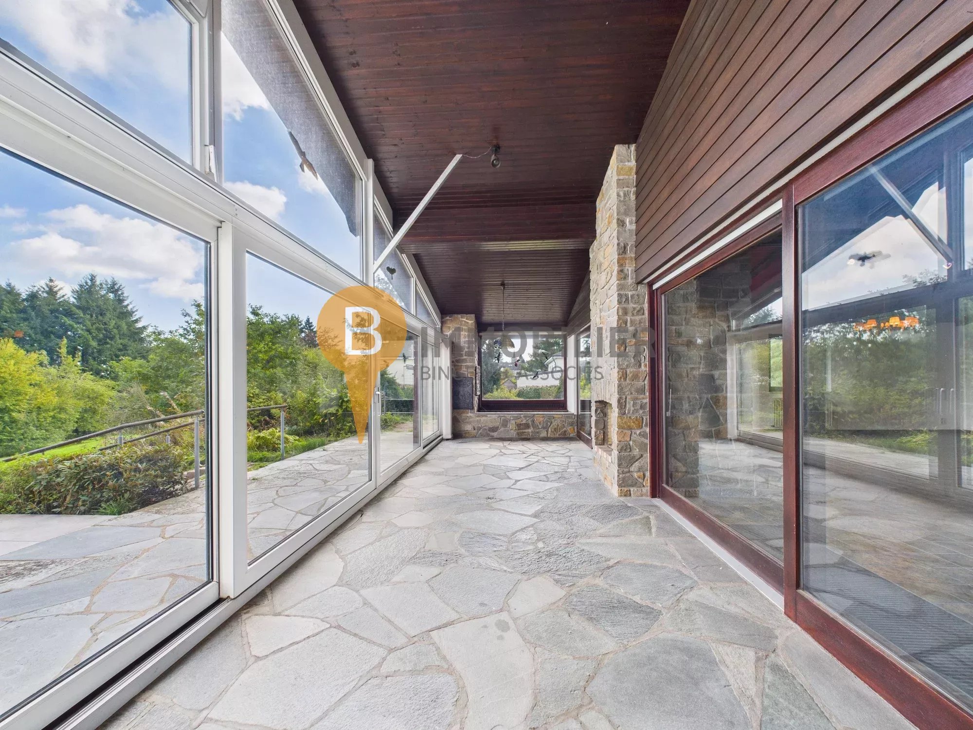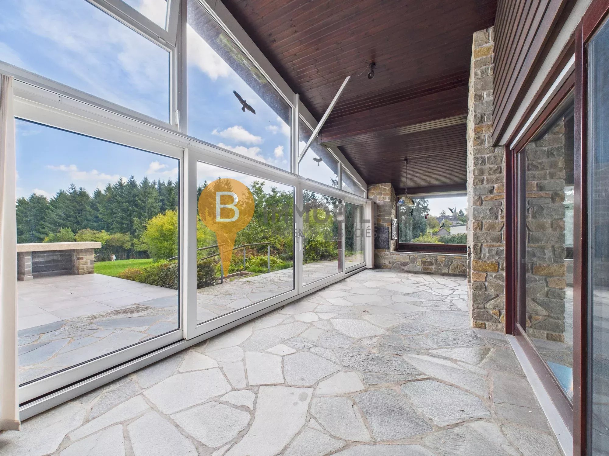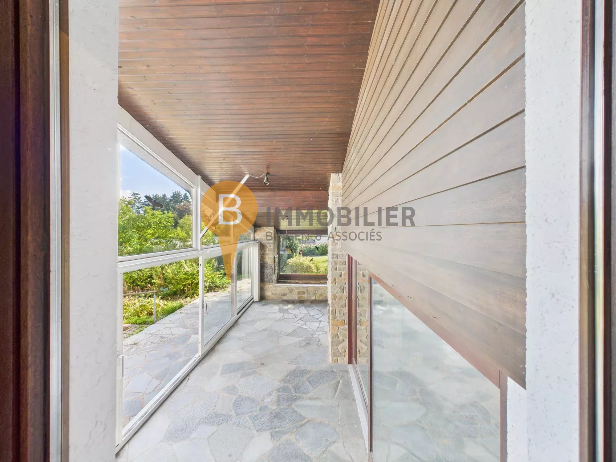 - Séjour/salle à manger lumineux avec cheminée en pierre, accès direct à la véranda vitrée