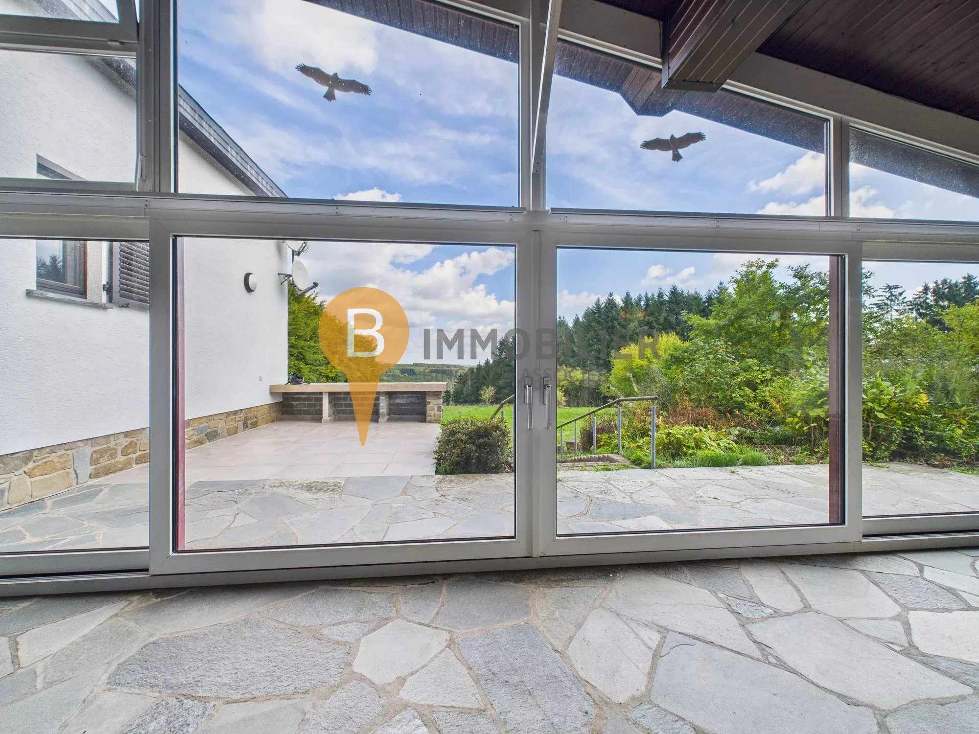 - Véranda à baie vitrée avec cheminée / barbecue et vue imprenable sur le jardin et les forêts